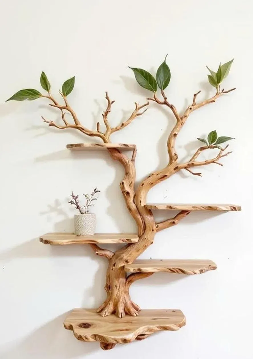 The handcrafted tree inspired wall mounted solid wood bookshelf offers a refined interpretation of natural branching forms for contemporary interiors. A central stem extends across the wall, with horizontal and angled arms creating multiple compact shelves for books and objects. The arrangement keeps items visible and accessible while turning the bookshelf itself into a decorative feature.